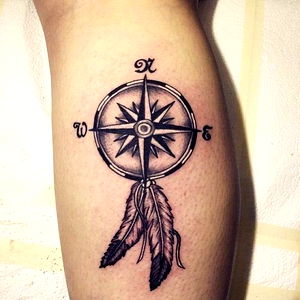 A unique tattoo design featuring a compass with the word 'Eagle' and the coordinates 'N 69.73 W 125.54'. This piece of body art is located on a leg, and the tattoo's design is complemented by a matching feather tattoo on the lower back. The model in question is Brandons, an OnlyFans creator known for his edgy style and fashion-forward content. Tattoos are not just about personal expression anymore; they can be a canvas to tell your story, and this compass tattoo does that beautifully.