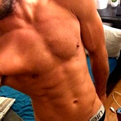 Photograph of a shirtless male model with visible abs, showing off his toned body and physique. The image has an intense focus on the model's muscles, suggesting that he maintains a strict workout routine to achieve his physique.