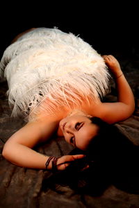 Jade Sparkles, a UK-based OnlyFans model, is seen in this image. She is sitting on the bed and wearing a feathered costume. The background is neutral, allowing her to stand out.