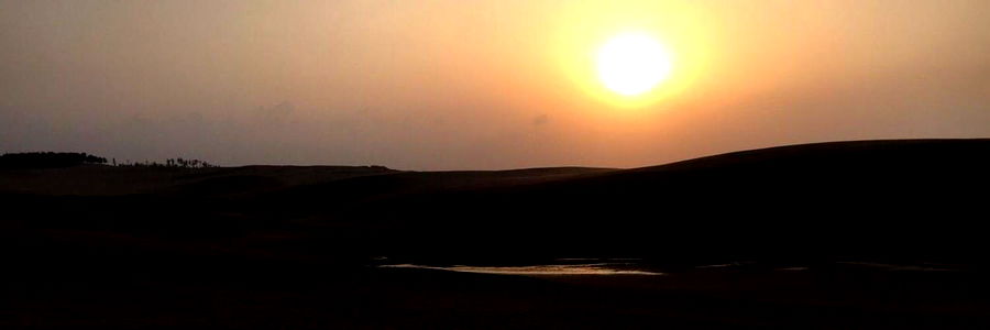A serene beach scene at sunset, featuring a warm orange glow on the horizon, casting long shadows and creating a sense of tranquility. A hazy sky in the background adds to the ethereal ambiance. The image appears to be taken from a higher vantage point, providing a panoramic view of the beach area.