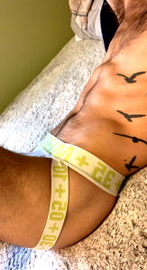 A male model showcasing his underwear in a relaxed pose. His tattoos are visible and he has a confident expression on his face.