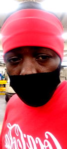 Jaykali, a model from Nashville, is seen wearing a red mask adorned with the iconic Coca-Cola logo. He is inside what appears to be a factory or workshop setting, suggesting a contrast between his fashionable attire and the industrial backdrop.