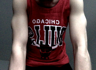A strong and athletic individual posing for a photo. They are wearing a red tank top with the word 'Chicago' on it, showcasing their well-defined bicep muscles. The person is also adorned with multiple tattoos and piercings, adding to their distinctive style.