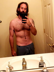 Jaysus, an OnlyFans model from Tucson, is seen in a bathroom mirror, showcasing his personal style with a full beard and a casual outfit. The image captures the intimate details of his life, hinting at a behind-the-scenes look into his personality and interests.