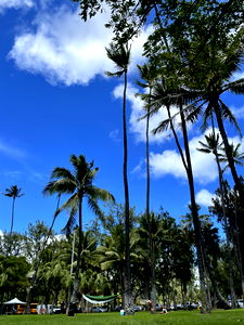 A tropical setting with tall palm trees swaying in the wind against a clear blue sky.