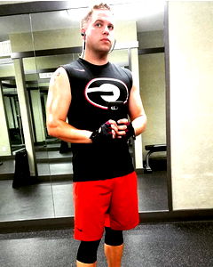 This is an image of a man in a gym, wearing a sports outfit and holding a drink. He appears to be in the middle of his workout routine.