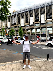 This is a photo of John Gonos, a sports enthusiast from St. Petersburg, FL, standing on a sidewalk in front of the iconic Santiago Bernabรฉu stadium, a famous football venue. He appears to be on vacation and is expressing his excitement for being at this world-renowned location. He's wearing a white t-shirt and sunglasses, suggesting a sunny day. His pose suggests he's posing for a fun photo opportunity. The stadium in the background features prominent signage, including 'Real Madrid', indicating its association with the professional football club.