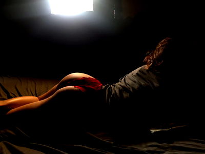 A captivating image of OnlyFans model Jozza, captured in a candid moment showcasing her stunning figure. She is seen wearing a red and black plaid shirt, lying on a bed with her arm casually resting behind her head.
