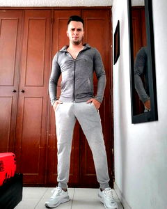 Fashion-forward Juan Ardila poses confidently in a gray tracksuit, standing in front of a mirror. His ripped physique and toned muscles hint at his dedication to fitness.