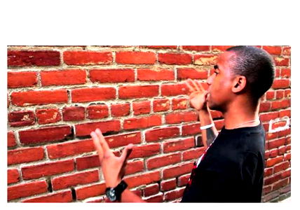 This image shows an individual, possibly a young male, gesturing towards a brick wall with a confident expression. The person is dressed casually and appears to be at an outdoor location. There are no visible texts or distinctive features that provide additional context or identity. The focus is on the interaction between the person and the background.