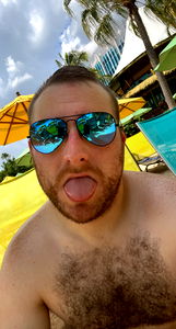 Shirtless man in sunglasses, making a playful face at the camera. He's wearing blue and yellow swim trunks, with a pool in the background. His tongue is sticking out in a fun pose. He appears to be a fitness enthusiast.