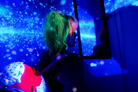 A model known as Theโขsoftey is seen posing for the camera, displaying a vibrant and unique fashion sense with striking makeup. They are donning an eye-catching outfit and accessories that give off a punk or emo vibe, topped with a playful bow on their head.
