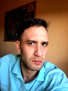 The image is of an individual who appears to be middle-aged. He has short hair, facial stubble, and is wearing a collared shirt. The background suggests an indoor residential setting. His expression is serious and he is making direct eye contact with the viewer.