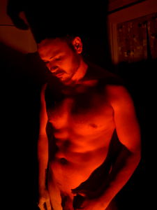 This image depicts an adult male model posing for a photo. The man has a distinctive expression on his face, with his hands held up to his mouth as if whispering or singing into the camera. His pose is striking, with his body facing towards the camera while his head is turned away from it, creating an air of mystery. The background features a purple and blue light effect, adding a dynamic and vibrant atmosphere to the scene.