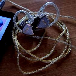 The image shows a smartphone with a photo of an Onlyfans model, specifically the ใซใซใข model. The model is wearing a pair of gold-colored wireless earbuds and is tied together by a rope. The background features a table, emphasizing the focus on the model and her accessory.