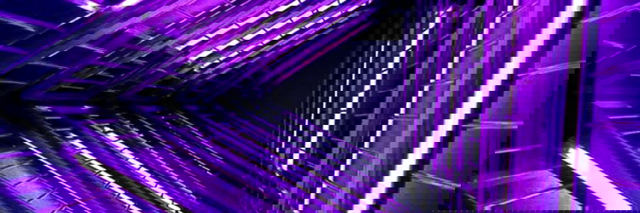 A vibrant and modern room bathed in purple light, featuring geometric shapes on the ceiling.
