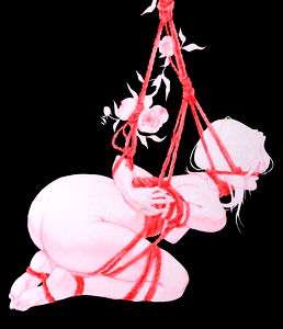 An artistically portrays a scene of a woman being tied up and suspended, surrounded by red roses. Katie Grace is the model for this piece. The artwork exudes a sense of passion and vulnerability.