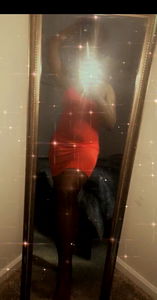 Stunning OnlyFans model Kayylashae showcases her confidence and style in a vibrant red dress, captured in this mirror selfie. The image is rich with detail, featuring sparkling confetti and a sleek black background that emphasizes the elegance of the model.