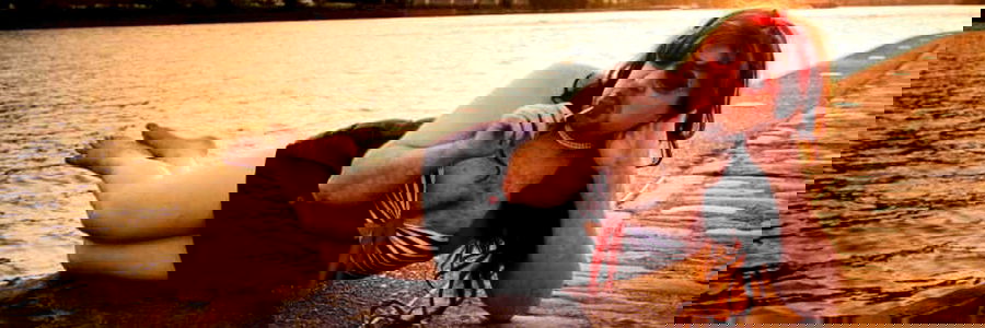 She's wearing her favorite bikini and posing for the camera with her long hair blowing in the wind. Her relaxed posture suggests she is enjoying her time near the water.