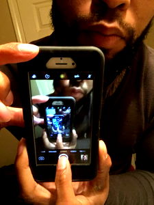 The image shows an individual holding up a smartphone to capture their reflection. The person appears to be indoors, and the reflection in the phone's screen indicates that they are taking the photo with the front camera. The background is not distinctly visible due to the focus on the person and the phone. The individual seems to have dark hair and is wearing what looks like a black top. There are no visible texts or branding within the image. The style of the photograph suggests it may be for social media sharing.