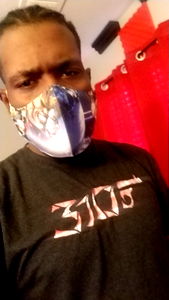 An OnlyFans model posing for a photo. He wears a black shirt and has a white surgical mask on his face.