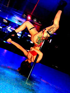 A stunning photoshoot of OnlyFans model Korra Daze, showcasing her dance moves on a stripper pole. Her outfit is risquรฉ and stylish, adding to the allure of the image. The background is blurred, placing full focus on the dancer's performance.