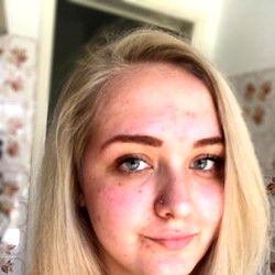 The individual in this image is Krem, who hails from Greece. She has long blonde hair and her eyes are blue. Her pierced septum adds an edgy touch to her overall look.