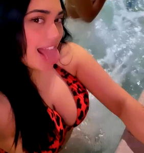 An attractive female model from Onlyfans. She is seen wearing a red and black bikini. Kristin has long dark hair and is showing off her playful side in this image.