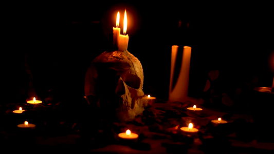 An intricately set up Halloween altar with a skull, candles, and red roses. The setup has an eerie vibe enhanced by the red roses and skull in the center.