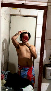 A person is taking a selfie in front of a mirror. They are shirtless and holding their phone up to capture the image. The background features colorful decorations and a wooden floor. There's a sign on the wall with temperature information. The individual appears to be in their early twenties.