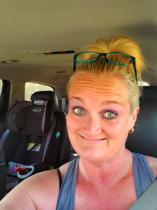 A woman with blonde hair and glasses is sitting outdoors. She's wearing a blue tank top and has a relaxed pose. Behind her, there's a picnic table with a green tarp covering it. A black tent is visible in the background.