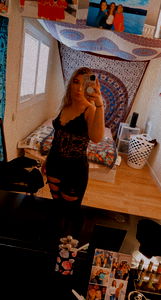 This image showcases a photoshoot of the OnlyFans model, Lila Krohner. The photoshoot takes place in a room decorated with a bohemian theme, complete with tie-dye decorations and a dreamcatcher. Lila is captured in an outfit consisting of a black dress, accessorized with a choker necklace, paired with open-toed high heels. She stands confidently against a white wall, which serves as the backdrop for this captivating photoshoot.