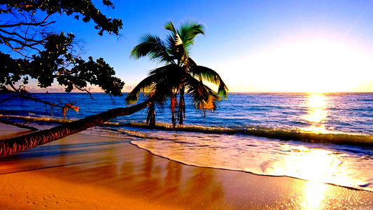 The image captures a serene moment on a sandy beach at dusk, with the ocean gently lapping at the shore. The sky is painted in hues of orange and pink, creating a beautiful backdrop for the tropical setting. A palm tree stands tall in the foreground, adding to the tropical vibe. This could be a great background image for travel content or a soothing visual for relaxation-themed materials.