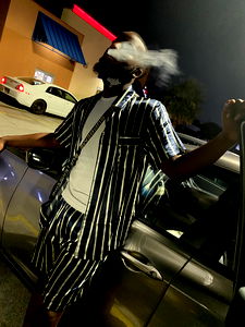 An African American man is leaning on a car, holding a cigarette to his lips. He's wearing a striped shirt with a collar and shorts. His facial expression suggests he's relaxed and enjoying a smoke. The setting appears to be an urban environment at night.