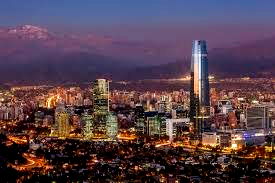 The image captures the breathtaking beauty of a modern city during sunset. The tall skyscrapers, illuminated against the twilight sky, stand out prominently against the darker areas of the city. In the background, majestic mountains add a touch of natural grandeur to the urban landscape.