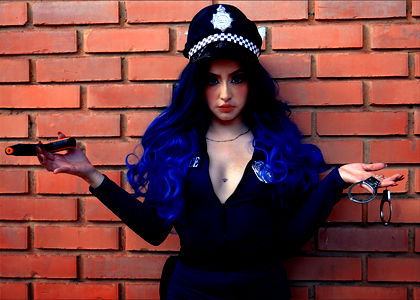 A professional model in a vibrant outfit, striking pose against an urban backdrop. Her hair is a striking shade of blue, complementing her dynamic style.