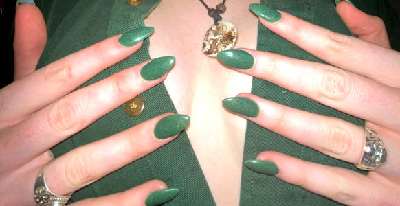 Elizabeth is a vibrant OnlyFans model from Colorado. Her nails are a striking teal, complementing her gold earrings. She's showcasing her unique style with an artistic background.