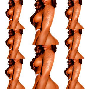 A creative and vivid photo of an Onlyfans model set against a colorful, possibly fire-themed background. The model is striking a confident pose with their back to the camera, showcasing their body art and tattoo.