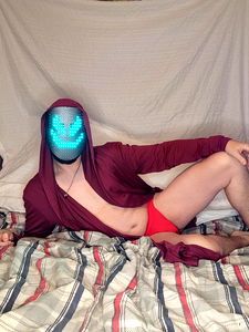 OnlyFans model Loki Veles showcases her creative side with a fun and quirky mask. Her mask features a playful smile with bright blue eyes, and she's even integrated LED lights into the design for added flair. 35 years old, Loki embodies her alter ego with confidence and style.