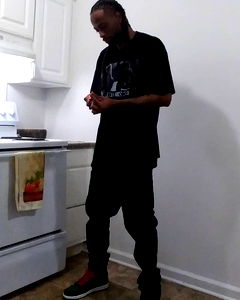 A man in a black t-shirt and baggy pants stands in front of a white oven, looking downward with his hand on his chest.