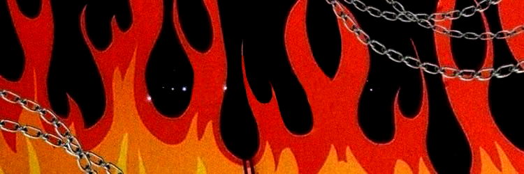 This is an image featuring a fiery inferno, set against a backdrop of flames. A chain is prominently featured in the foreground, suggesting a theme of restriction or entrapment. The style of the image gives it a somewhat gothic and dramatic feel. The model appears to be a young adult female.