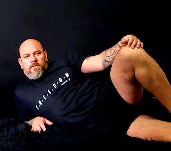 A muscular man stands confidently with arms crossed, wearing a dark t-shirt. His tattooed torso suggests a strong personality or perhaps a background of toughness or rebellion.