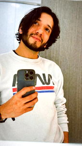 Lucianian is captured in a mirror image, posing with a phone in hand. He's dressed casually yet fashionably, exuding a modern and trendy vibe.