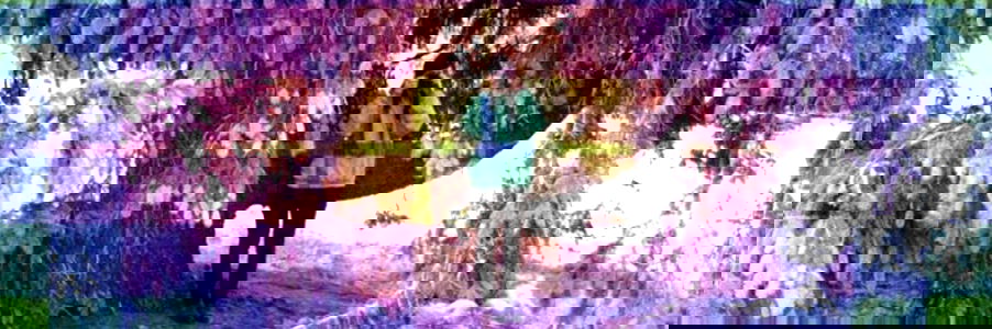 The image is a blend of a real-life photograph and digital artwork elements. The individual stands in front of a vibrant tree with purple blossoms, creating a unique and vivid background that contrasts with their casual attire. This style of photography may be appealing to those who enjoy fashion, nature, or creative composites.