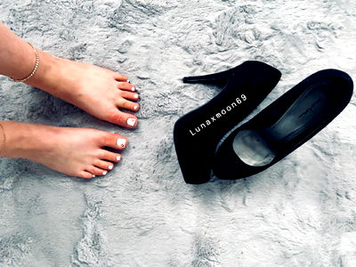 Onlyfans model Luna is seen displaying her high-heeled feet, with one foot featuring pedicure art. The photo captures a moment of casual elegance.