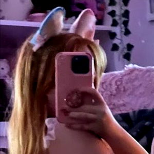 The image shows a young woman taking a selfie. She is wearing animal ears that resemble bunny ears and has her phone held up to take the photo. Her hair is long, and she appears to be in a room with a casual background. She is also holding a stuffed toy, which could be a plush animal or a character from animation. The style of the image suggests it might have been taken on an app that allows users to add ears and other accessories to their photos. There is no visible text in the image.