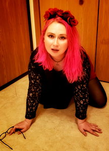 A captivating image of the talented OnlyFans model Madam Silas from Wisconsin, showcasing her vibrant pink hair and a striking red rose headband. Her unique style is accentuated with her choice of attire.