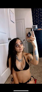 This image showcases a stunning young woman who is confidently striking a pose in front of a mirror. She's wearing a black bikini top paired with matching sunglasses, radiating an air of fashion-forwardness. The model appears to be outdoors, indicated by the natural lighting and lush surroundings. Her tattoos and accessorized look add to her overall allure, making this an appealing image for fashion enthusiasts.
