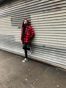 This image captures the model Marcel Ke' Von, a native of Michigan, standing poised in front of a closed store. He is dressed casually in a vibrant red hoodie and blue jeans, exuding an air of urban style. The shuttered storefront behind him suggests a setting that is perhaps more about the model than the location.