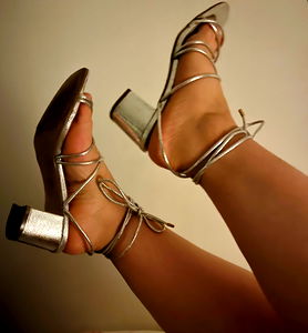 High fashion style showcased with open toe heels on a light wooden floor. Maria is a content creator and influencer from Paris, France.